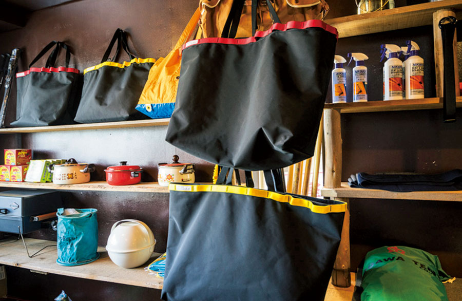 古いテントやタープは販売することもあるが、その生地はトートバッグなどの材料にも活用されるそう。奥の工房でミシンを踏むのは、妻の恵里さんが担当している。「一日集中して3つできるかどうか」というのだから、常に予約待ちの品薄状態なのもうなづける。オリジナル商品はジャンルごとに「ダイス」、「ククチ」、「ディセンバー・オリジナル」と、現在は3つのラインを展開中だ。
