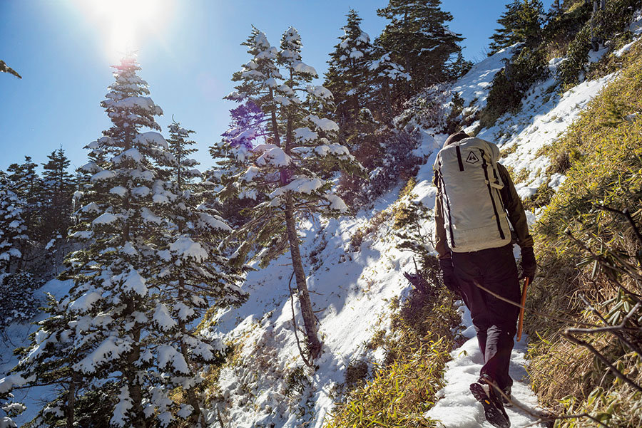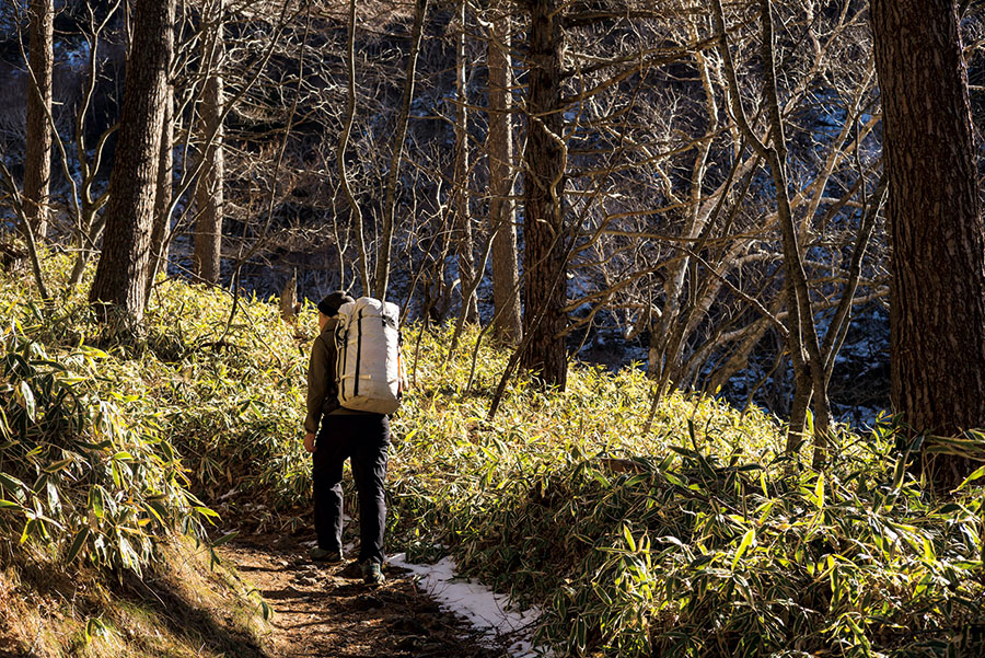雪が少なくて拍子抜けのスタート。バックパックはハイパーライトマウンテンギア。容量70ℓと日帰りには大きめな印象だが、撮影機材やクランポン、ヘルメットなど雪山装備も詰め込んでいる。