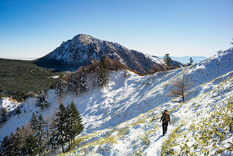 三角形のような山容が特徴的な牙山。「前々から登りたいと思っていました。外輪山の黒斑山からもよく見えるので。でも、もっと雪が積もってからですね」とは宇佐美さん。