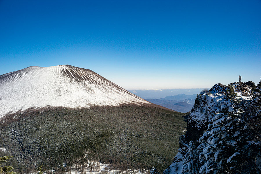 えいやっ、1歩、2歩。えいやっ、1歩、2歩。アイスアックスを振り下ろし、雪に足を取られながら進んでいくと、ようやく外輪山の稜線に立った。振り向けば、お椀を引っ繰り返したような形の浅間山がどーんとかまえている。