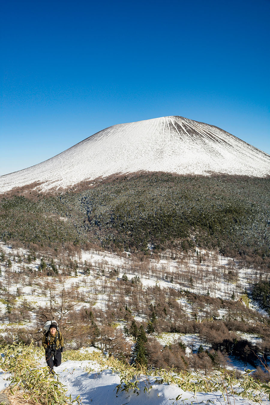 11月末、宇佐美さんの撮影山行に同行することになった。早朝から関越自動車道をひた走り、向かう先は雪化粧をした浅間山。雲ひとつない、とびっきりに冬晴れの1日だ。