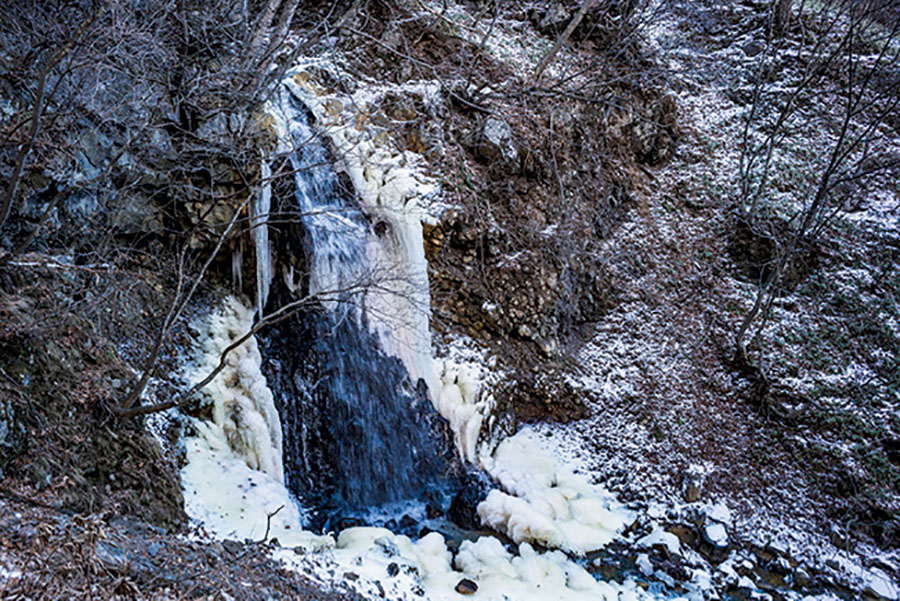 ③一ノ鳥居から右に進めば、30分もせずに不動滝が見えてくる。その落差は10m以上と迫力十分。夏と冬で写真を撮り比べてみたい。