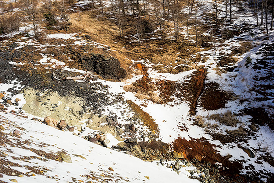 ④このあたりで急に硫黄の臭いが立ち込めた。山肌も特徴的な色をしている。浅間山が活火山であることを実感するタイミングになるだろう。