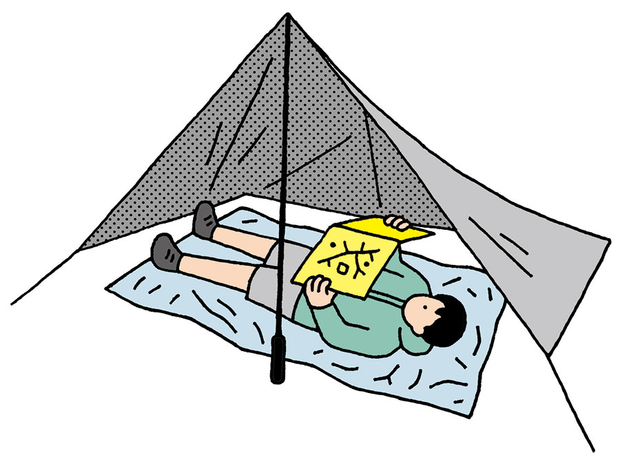 王道を行くのであれば、タープかツエルト。大幅な軽量化を図ることができるだけでなく、自然との一体感をより味わえるところが魅力である。とくにタープは開放感と野宿感が体験できるので、通常のテント泊とはまた異なるおもしろさが発見できるはず。