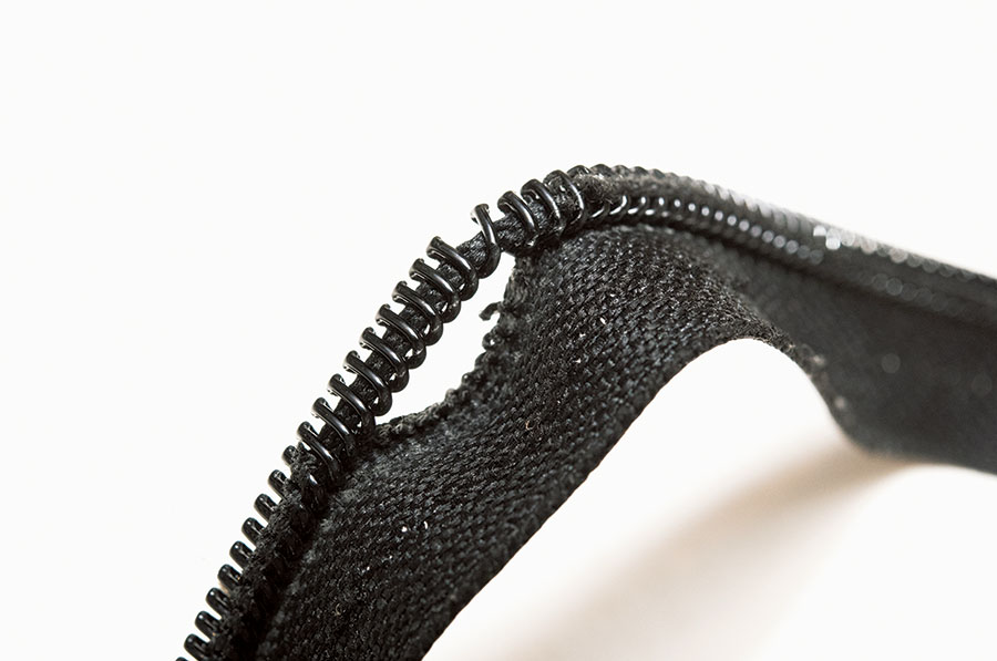 もっとも多いのが、コイルをファスナーテープに縫い付けている糸が切れてしまうケース。一方の生地に荷重がかかった状態でのファスナー開閉は、できるだけ避けたい。