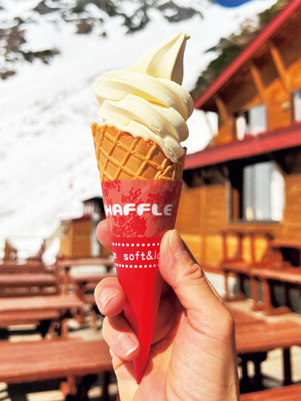 登山の合間に、ソフトクリームはいかが?液体原料から練って作る本格マシンで提供している。甘党が喜ぶメニューは他にもある。