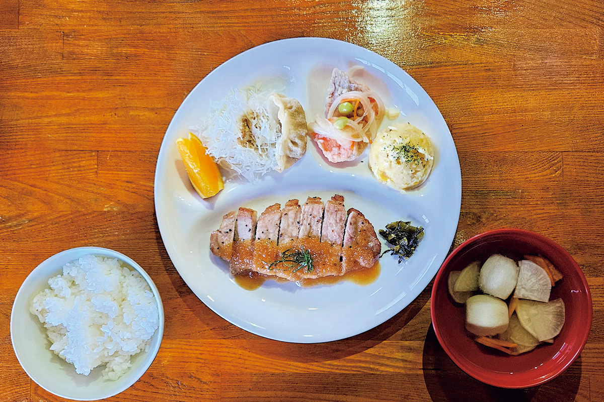 【夕】ポークソテー、ポテトサラダ、マリネ、焼き餃子、野菜サラダ、漬物、フルーツなどを提供。主菜はチキンソテーまたはサーモンになることも。ご飯と汁物はおかわり自由。