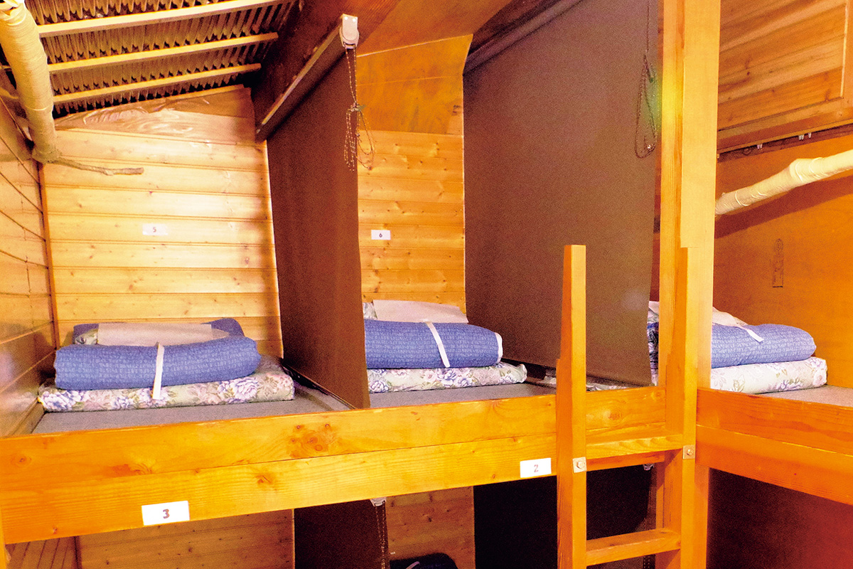 仕切りを設けてスペースを区切った大部屋(写真上)のほか、追加料金が必要な個室(写真下)も6部屋ある。2階の宿泊エリアは天井が高いので、二段式の蚕棚が基本となる。着替えの際は、更衣室を利用できる。