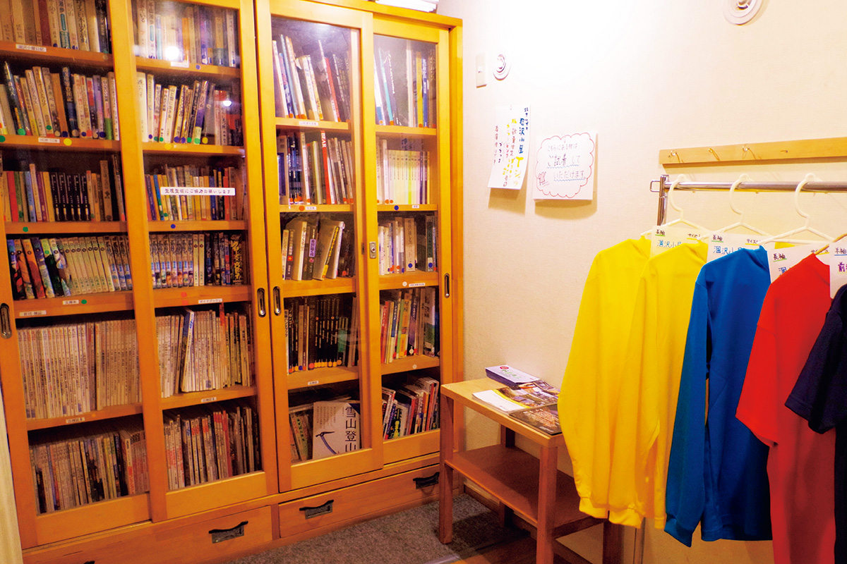 受付そばの一角に、写真集、雑誌、マンガ、専門書などが詰まった本棚がある。悪天時の停滞も安心。特定の談話室はないので、自室でゆっくり読もう。