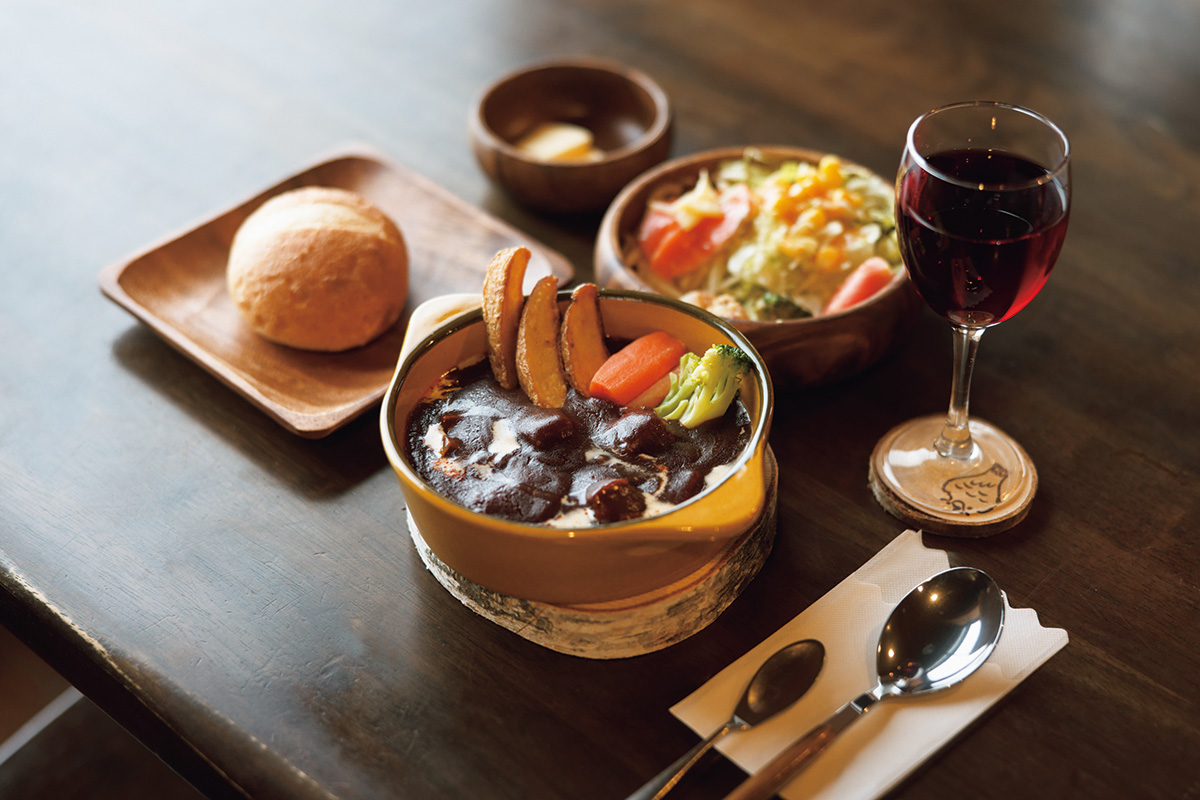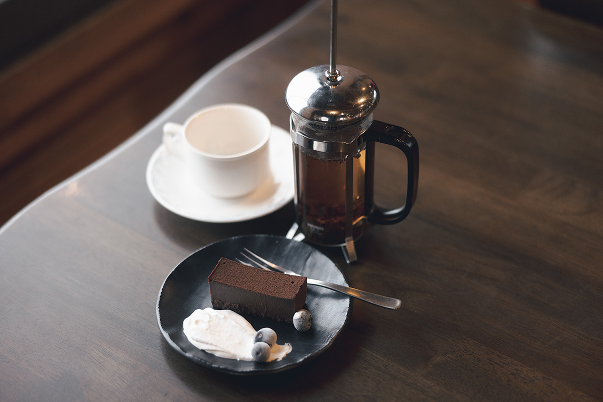 別棟のレストラン。山の上とは思えないようなオシャレなケーキやコーヒー、生ビール、宿泊者の特別メニューとして提供するビーフシチューもここで食べられる。大きな窓からは杓子岳や白馬鑓ヶ岳が望め、至福のひとときだ。