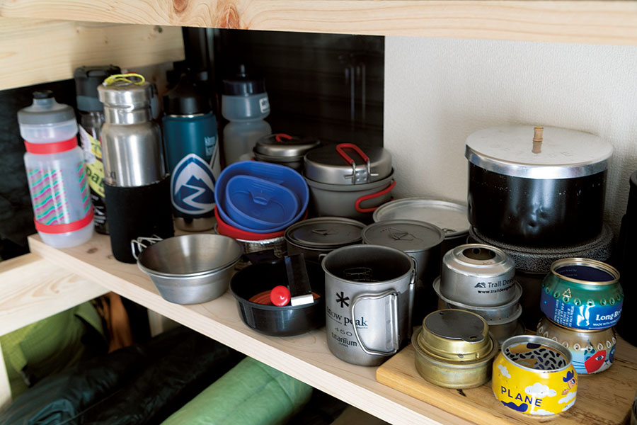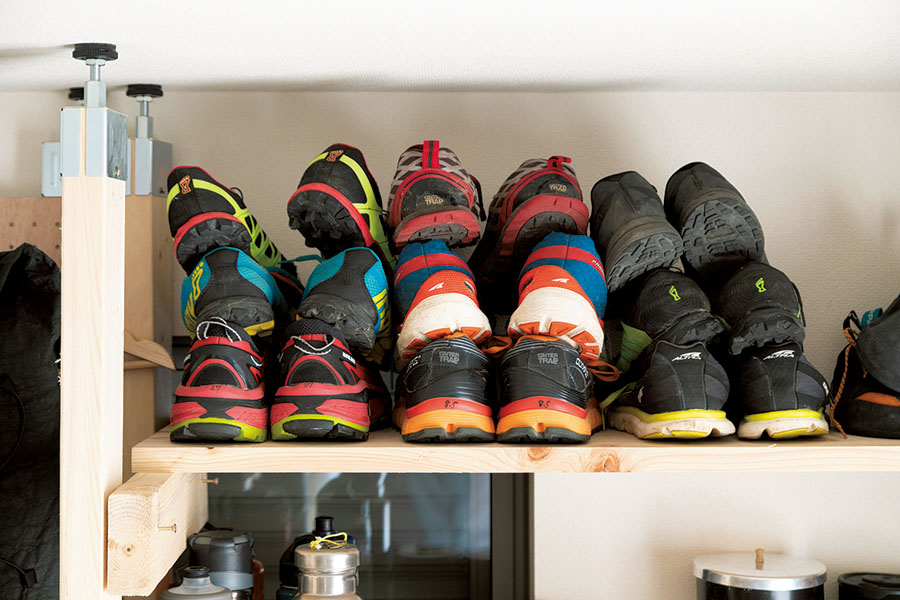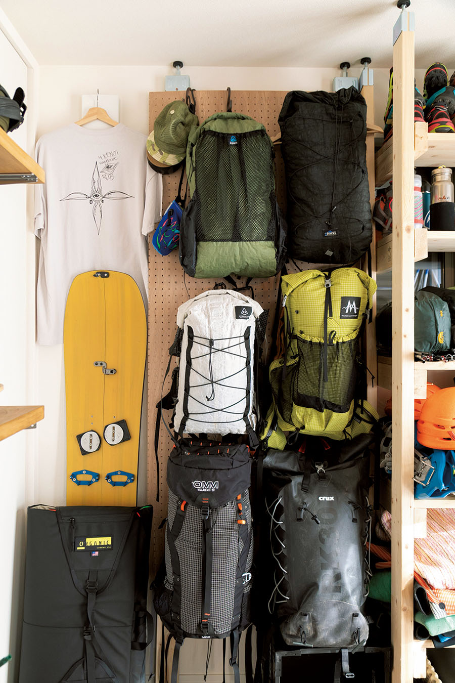 「スタイルの基本は、より荷物を軽くして、より早く行動すること。毎週末、出かける先はシーズンやその日の天気などによって直前に決めることも多いので、思い立ったらこの棚からささっとギアを取り出せるようにしています。パックに詰めたら準備OK、即出発できます。片づける際も、そのまま棚に戻すだけ。見える収納は行動しやすくて便利です」