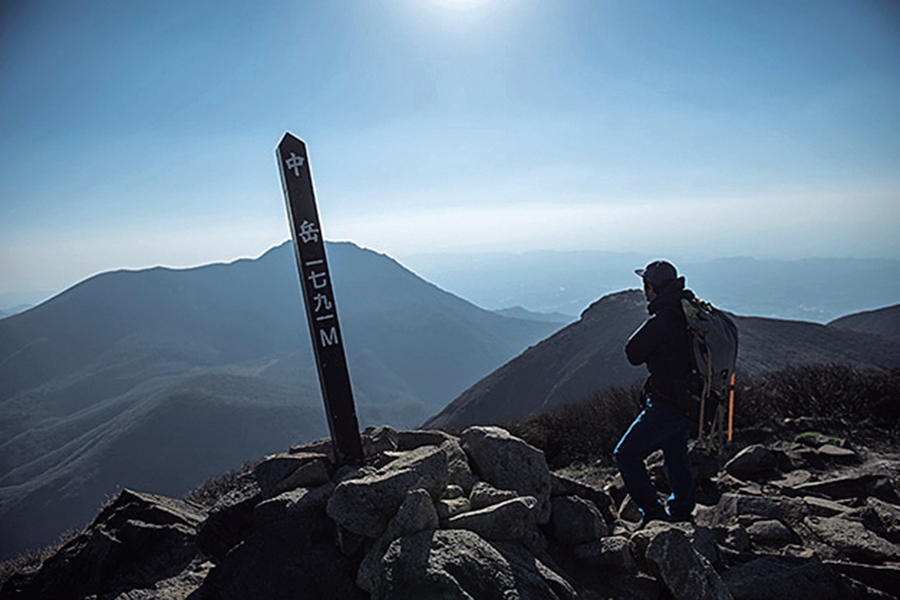 ③九州本土の最高峰・中岳山頂。南の方角には、無数の渓と丘が襲のように連なる、阿蘇の力強い地形が広がっている。