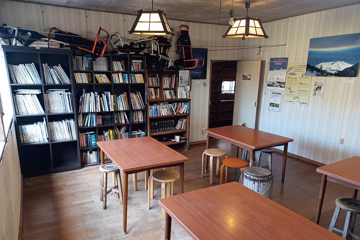 山関連の雑誌や書籍、囲碁などのゲーム類がある談話室。本小屋を基点に連泊利用する登山者も多く、自炊者も多い。自炊室を兼ねているので、夕食時は混雑する場合もある。