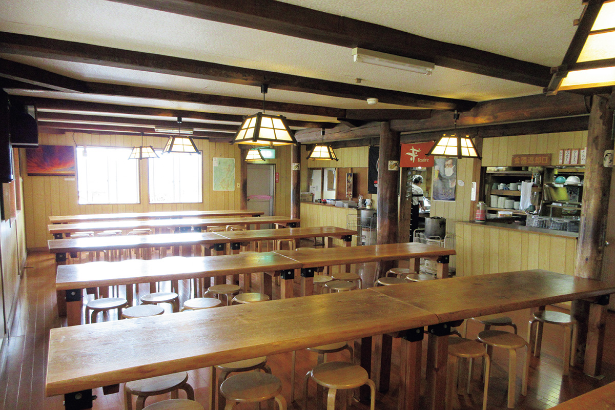 昼食時にはカレーライスやうどん、スパカレー、おでんなどをいただける食堂。混雑時は入替制。朝・夕食の時間は、受付時にもらうチケットに指定されている。