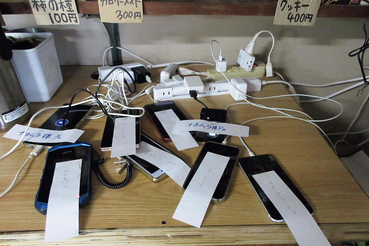 受付に携帯電話を預けるシステム。1台¥200。携帯電話に名札を貼り、受付スペースの内側で充電してくれる。盗難や取り間違いの心配がなく、安心安全。