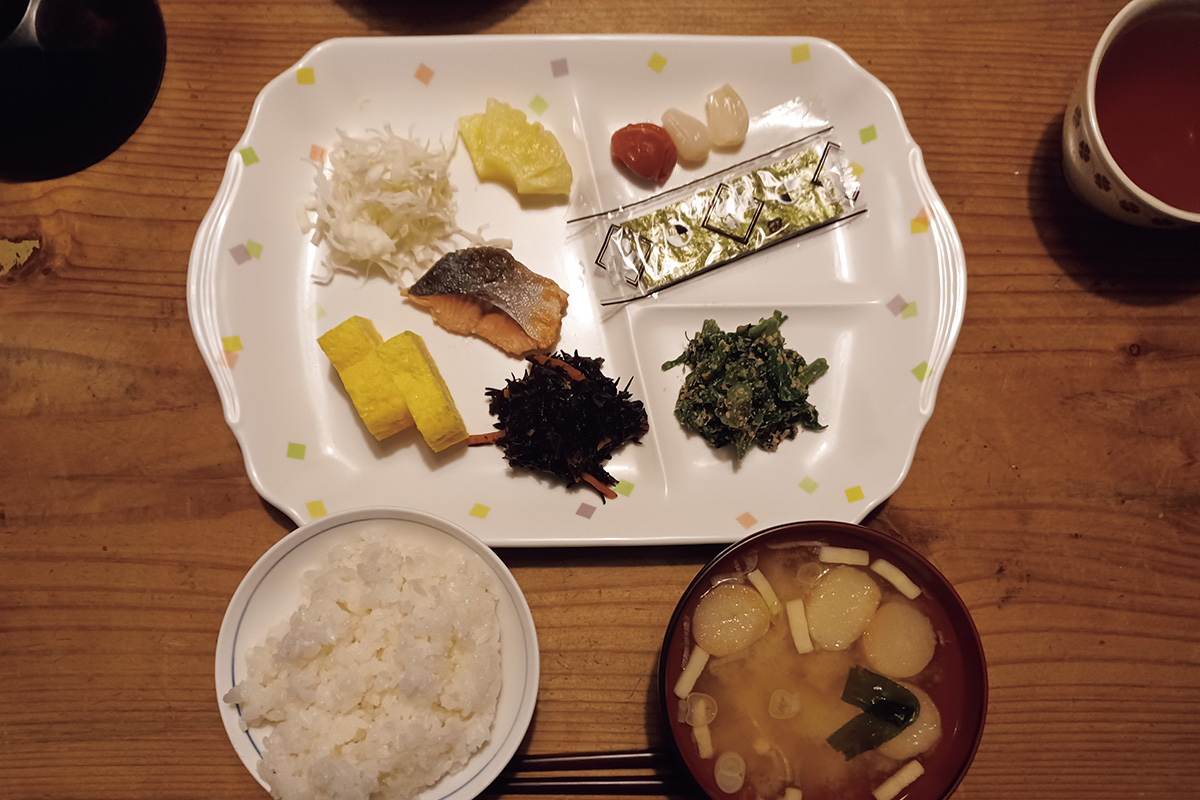【朝食】焼き魚の切り身、卵焼き、ひじき、漬物、生野菜、味付け海苔など、和食の定番的朝食は胃に優しい。ご飯と味噌汁は、もちろんおかわり自由。梅干とらっきょうもうれしい。