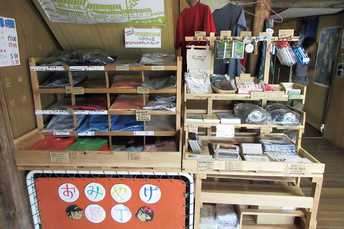 小屋オリジナルの化繊Tシャツが大人気。生ビールや飲料も豊富。立山のガイドや薬師岳登山の歴史書も!