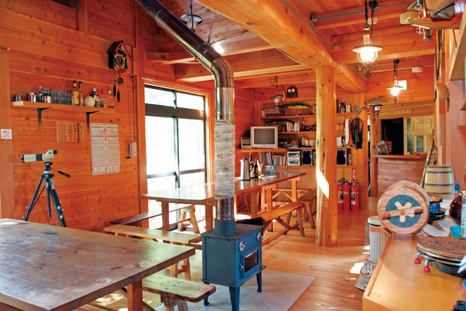 黒部の奥地にありながら、平乃小屋は「山小屋」というくくりにしてしまうには少し違和感がある。イワナの職漁師の家系に育った佐伯覚憲さんは、もちろん渓流釣りの名人。その名人を慕ってくる釣り愛好者が多い宿だからかもしれない。建物に入ると、山小屋というよりも知り合いの家を訪れたような気がする。ログハウス調の居間には、本や釣竿、酒瓶が並べられており、ご主人の趣向が伺える。