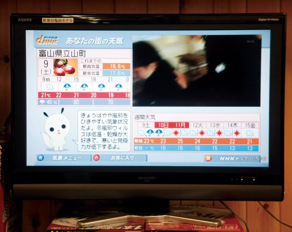剱岳に登るには事前の天候チェックが必須。食堂には大型テレビが設置され、天気を確認することができる。