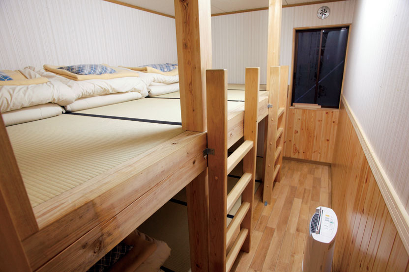 剱澤小屋の客室はかいこ部屋のみ。各部屋には除湿機が完備され、快適に保たれている。布団はミズノのブレスサーモを使用している。上段には木枠がないので、落ちないよう注意。