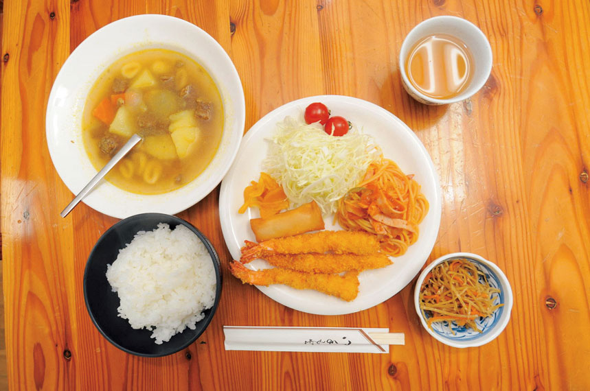 大きな3尾のエビフライに春巻き、パスタ、きんぴらごぼうなどボリュームたっぷり。翌日への活力をしっかりチャージしよう。