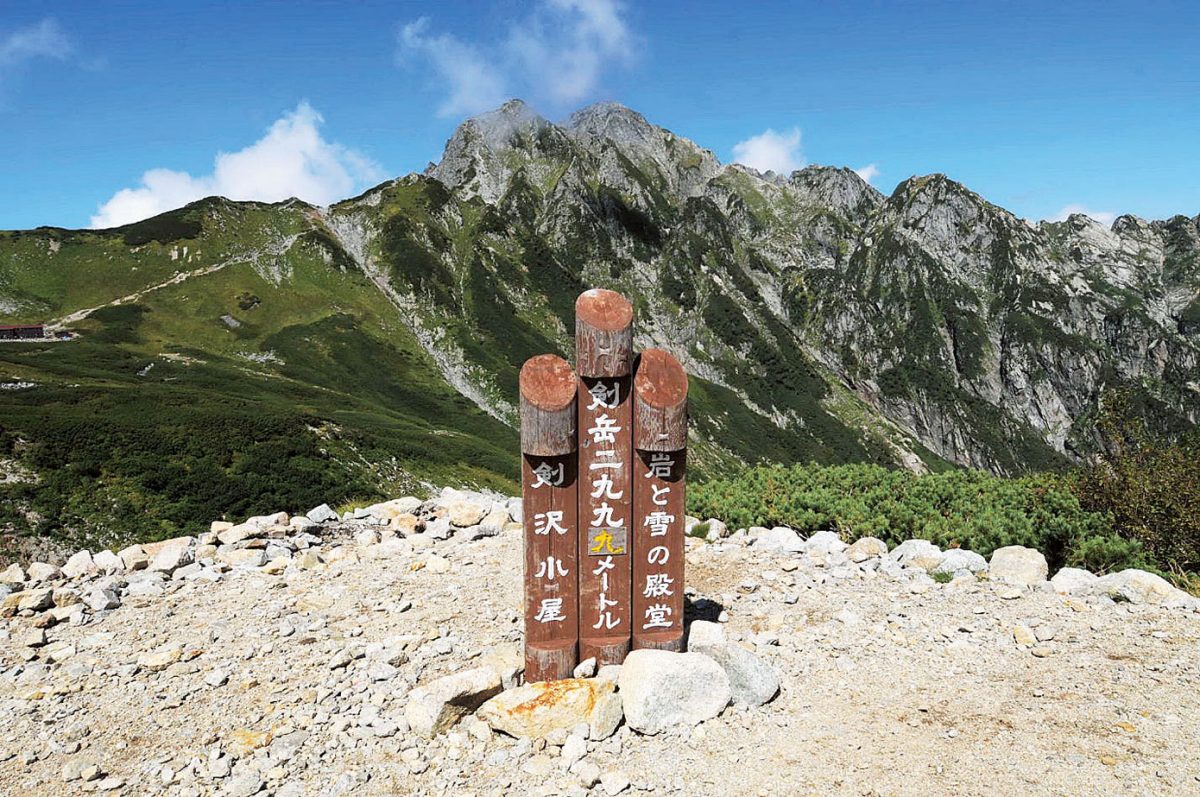 剱岳が眼前にそびえる剱澤小屋。小屋の前には「岩と雪の殿堂」と書かれた標識が立っており、オススメの撮影スポットだ。天気がいい日はここで記念撮影をする人多数。装備が心配な人はスタッフに相談してみよう。的確なアドバイスがもらえるはずだ。