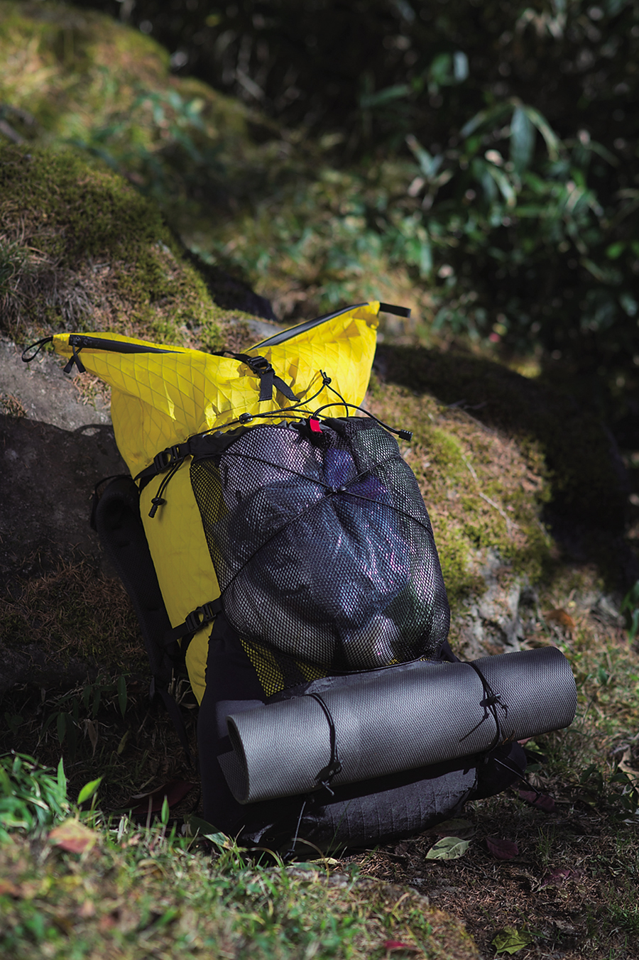 斬新なフォルム、特徴的な開口部、ワイドなショルダーハーネス、独自のセンターコンプレッション方式など、プロダクトデザイナーとして数多くのバックパックデザインに関わってきた「マイスター」らしい、オリジナリティあふれるアイデアの塊。ファストパッキングだけでなくハイキングや自転車にも調子良さそうだが、それって全部徹さんの好きなアクティビティだったり……。