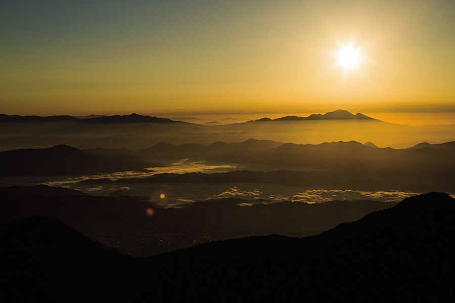 どうにか日の入りに間に合った。稜線はまだ赤く輝いているが、太陽の光はもうその力を弱めて、光が届かなくなった空はやがて色をなくし、紫から濃紺へと見事なグラデーションを見せる。