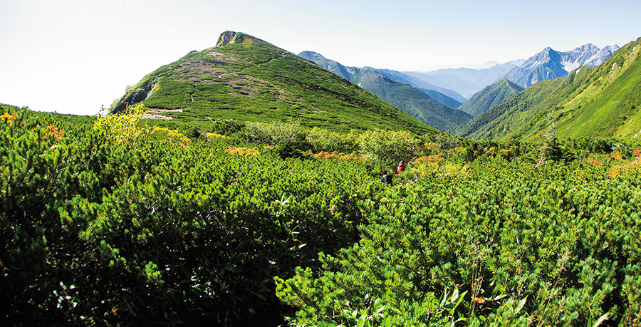 登山道が右に大きく曲がり、槍ヶ岳が見えなくなると、いよいよ帰るのだと実感する。ハイマツの海を泳ぐように、細いトレイルを進む。