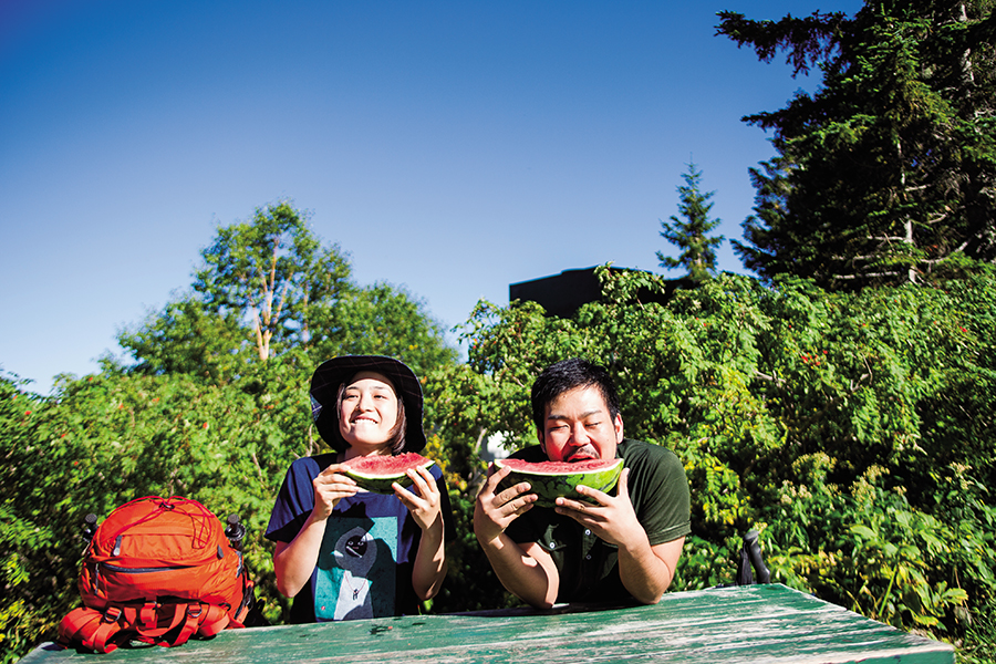 富士見ベンチを過ぎると合戦小屋が見えてきた。ついさっき荷揚げ用のケーブルで頭の上を飛んで行ったスイカが、ほどよく冷えて待っている。食わない手はない。