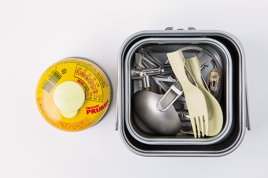 軽量コンパクト分離型ストーブの代表、ウルトラ・スパイダーとカトラリーがぴったり収まる。コンパクトながら、1ℓ、0.6ℓの大小鍋とそれぞれの蓋、焦付き防止加工されたフライパンのセット。四角い袋麺を割らずに煮られる角形クッカーは、パック内での収まりもよく、角を使って湯を注ぐのもラク。大鍋のみなら小型缶と一体型ストーブを収納可能。