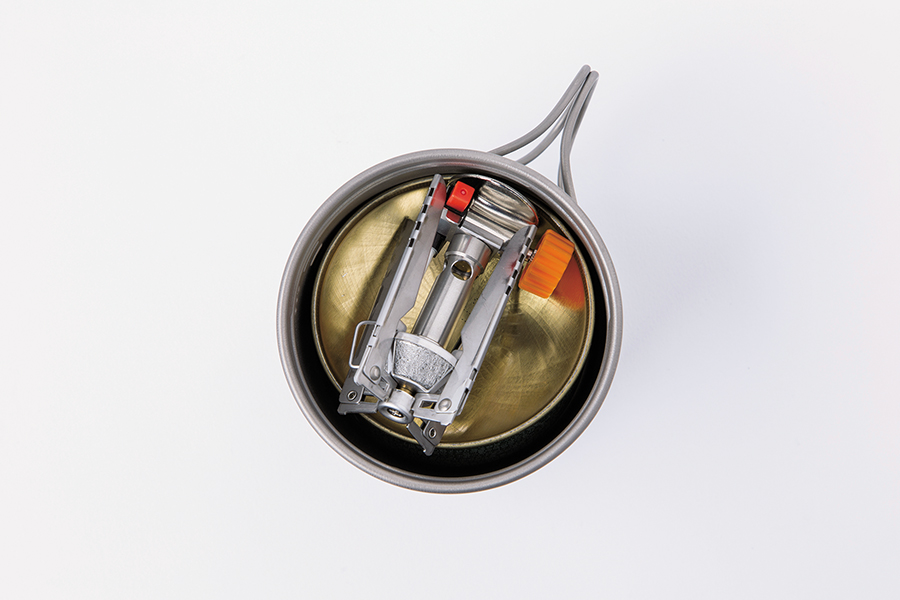 湯沸かしするポットと水筒としても使えるボトル機能を併せ持つことから商品名は「ボット」。チタン製のUL系アイテムで超軽量。アルコールストーブと使うのが定番だが、小型缶と一体型ストーブを収納できる容量0.7ℓの絶妙な収納性を活かしたい。高火力、耐風性にすぐれたREVO-3700 と合わせた総重量は、燃料缶も含めて421g。