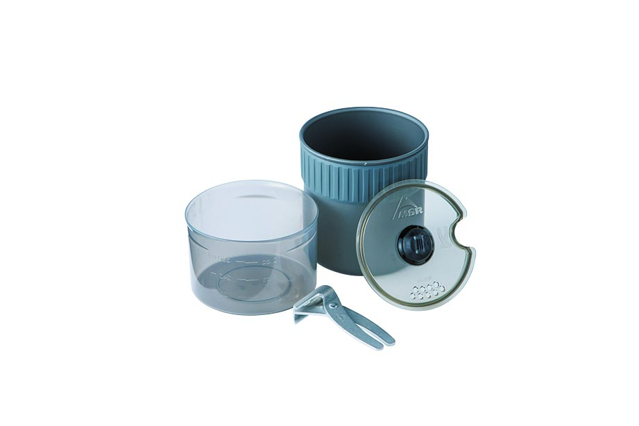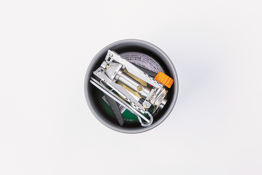 自分好みのスタッキングを探すのもよいが、メーカーが工夫を凝らしたクッカーセットを使うのだって問題はない。このアルミ製深型クッカーは、上部に断熱グリップ、下部にポリプロピレン製カップを装備し、小型缶、一体型ストーブを収納可能。0.75ℓの容量で、クッカーを持ってラーメンを食べ、付属のカップでお茶も楽しめる。
