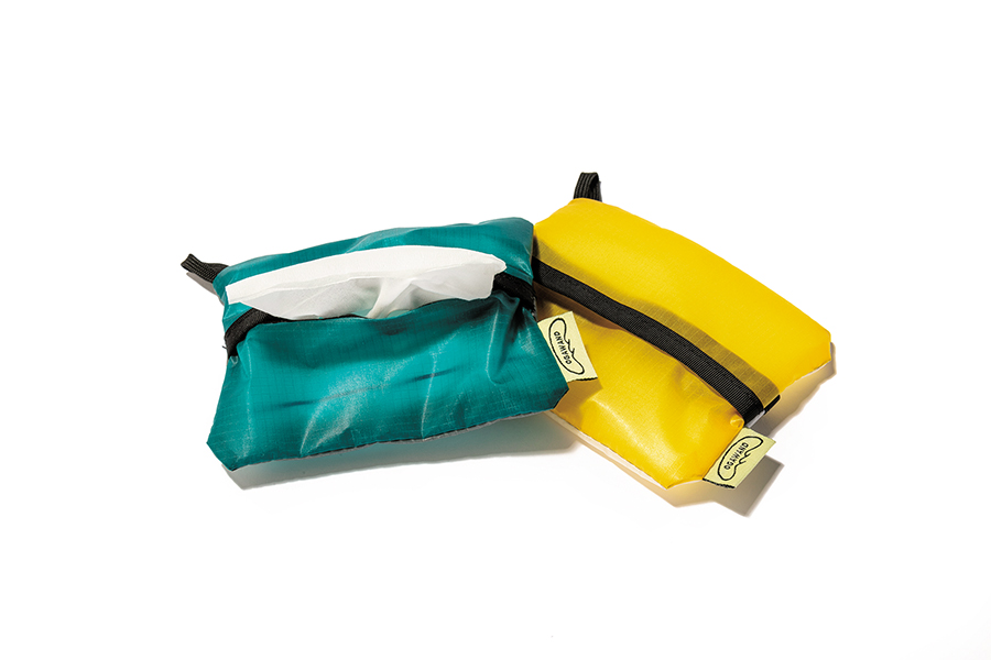 両面にポケットティッシュを収納できるケース。表はトイレ時にあると便利なポケットティッシュ、裏はクッカーや手、体を拭けるウェットティッシュなど、最大3個収納でき、予備もあれば使い分けできて便利。