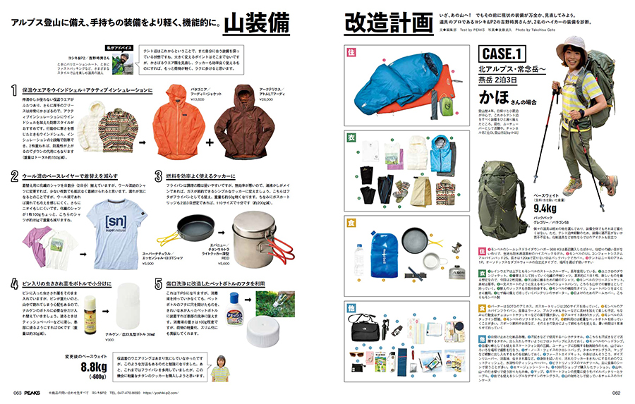 いざ、アルプスへ! と向かう前に、現状の装備が万全か見直してみる、登山装備改造計画。道具のプロであるヨシキ&P2の吉野時男さんが、2名のハイカーの装備を診断。