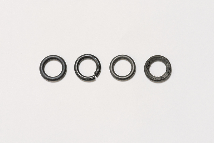 右から「潰れとささくれ」「硬化と変色」「破断」。どれもガス漏れの危険性があり、兆候が見られたら早めの交換を行なうこと。Oリングはショップで入手可能。