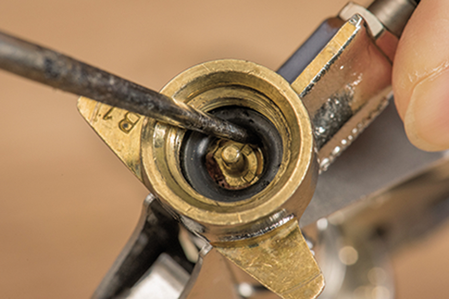千枚通しなどを使って、古くなったOリングをバーナーの基部から引っぱり出して、新しいものと交換する。押し込むのには箸の先などを使って傷つけないようにすること。