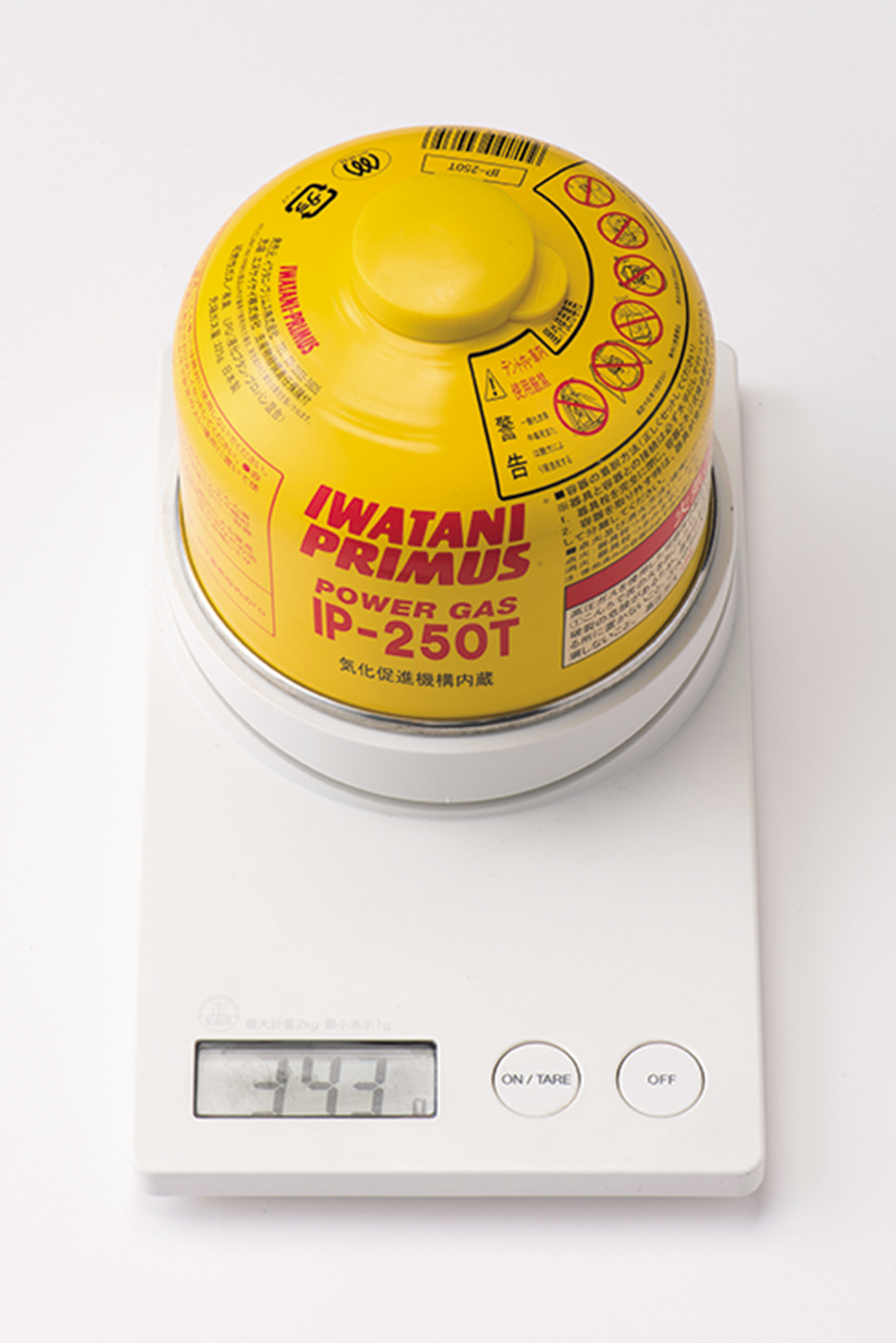 新品の状態と使用したあとの重量を計り、ガスの使用量を推し量る。どのくらいの火力で何時間使うと、残量としてあと何回くらい使えるのか計算しておくといいだろう。