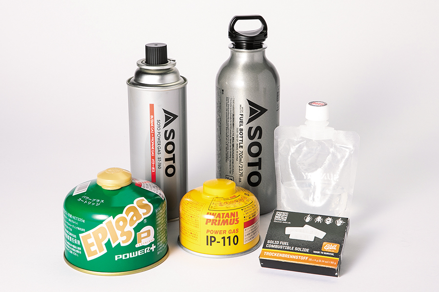 ガスはOD缶(250、110サイズ)とCB缶、液体燃料(ホワイトガソリンやアルコールなど)、固形燃料がある。ガス缶の中身はブタン、イソブタン、プロパンの3種類があり、混合比率はブランドで異なる。中身がブタンガスのみの場合は外気温が10℃以下になるとパワーが半分以下に落ちるので注意。