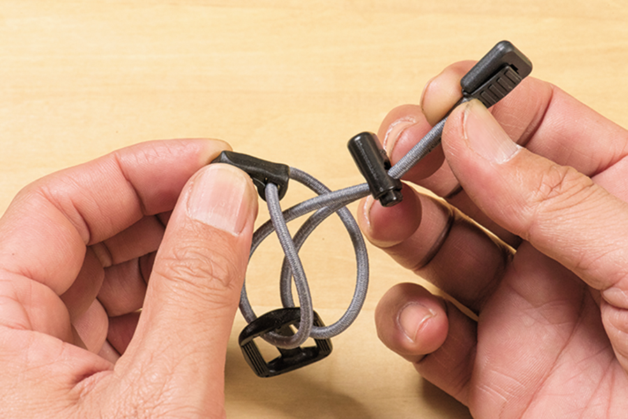 指でつまんでストッパーの穴が開いた状態にしてから、コードにストッパーを通す。