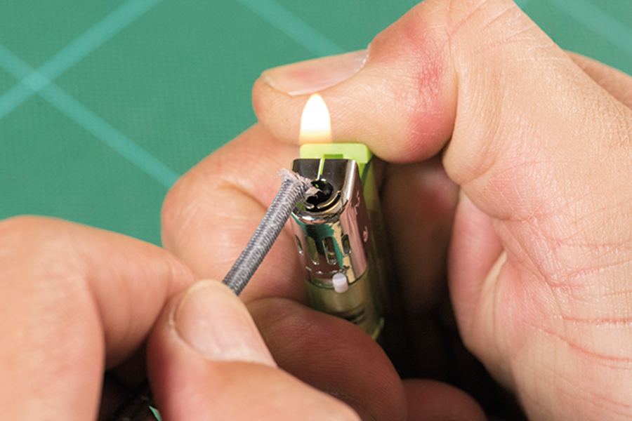 コードの末端がほどけてこないようにライターで炙る。少し溶かして固めるイメージで。
