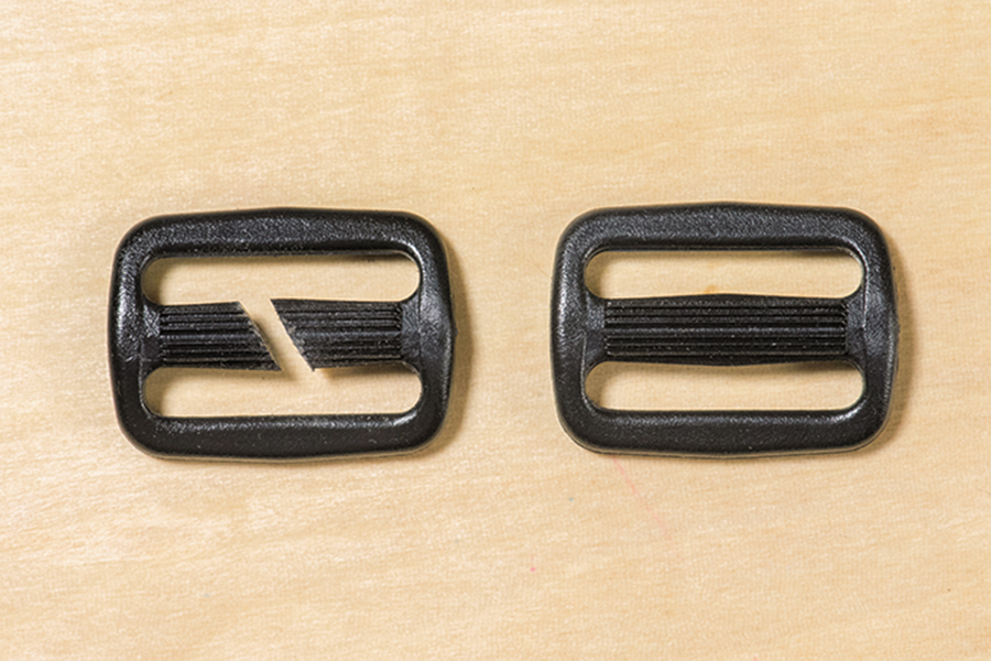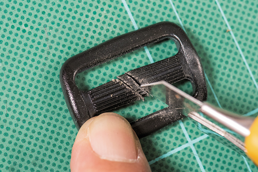 ベルトアジャスターの真ん中のパーツを3㎜のすき間が開くように、斜めにカットする。