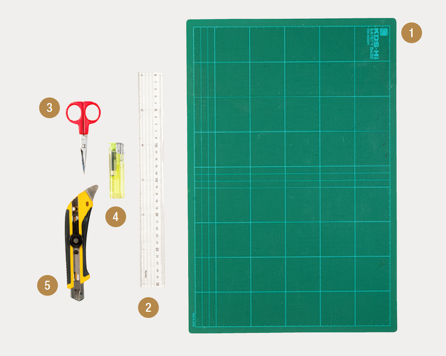 ❶ カッターマット ❷ 定規 ❸ ハサミ ❹ ライター ❺ カッター