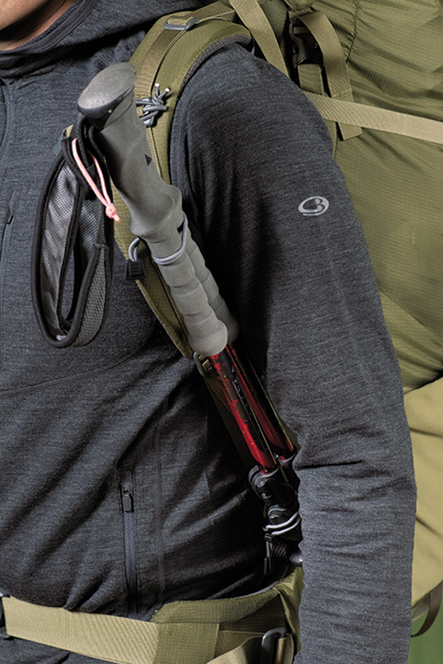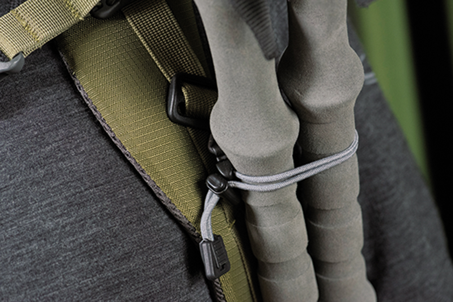 ショルダーハーネスのパッドがある部分と、ストラップのみの部分それぞれにホルダーを取り付け、コードでポールを押さえる。手の動きを妨げないので、スムーズな行動が可能に。