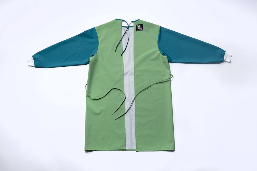 素材はポーラテックのネオシェル。アウトドア業界においても最高基準の防水性と通気性を併せ持つ素材として 多くの製品に使用されているが、医療雑品としての基準(AATCC)を満たしていることから、高機能素材のストックを使用して国内生産を決断。