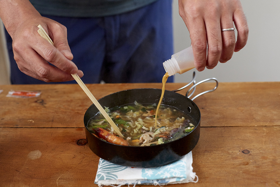 ❷沸騰したら火から下ろし、合わせ調味料をすべて入れてかき混ぜる。具材を片側に寄せ、かた焼きそばを添えればできあがり。