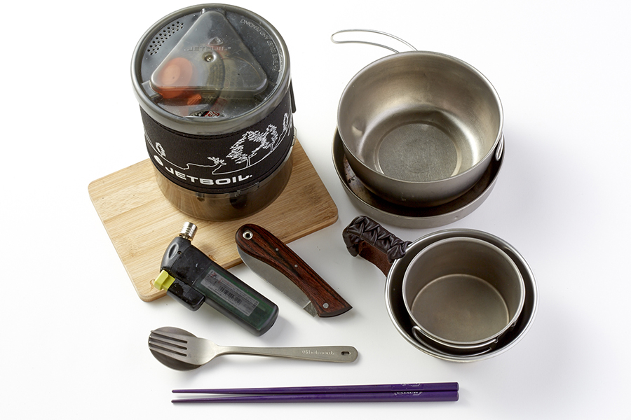 オールインワンクッカーのジェットボイルを熱源とし、ナイフやまな板を組み合わせたセット。