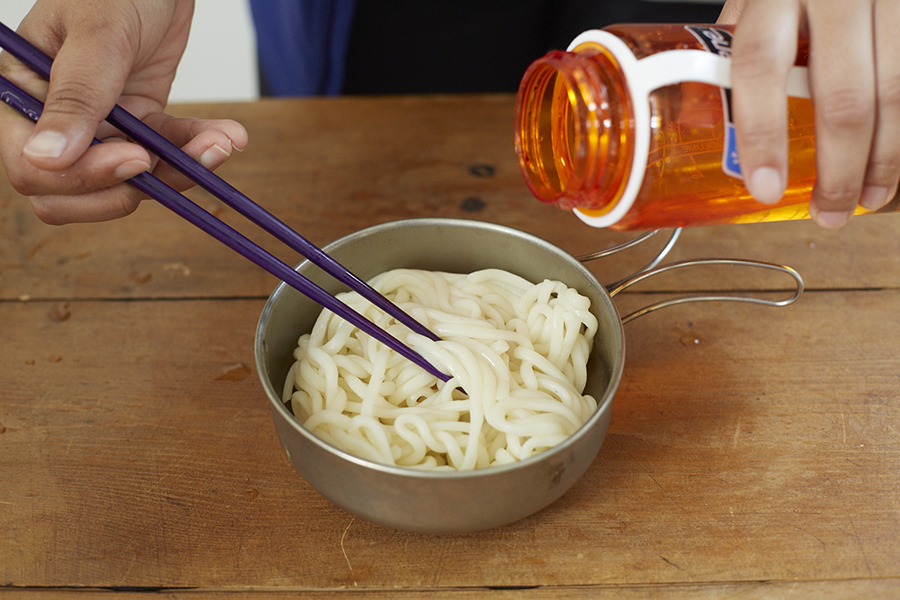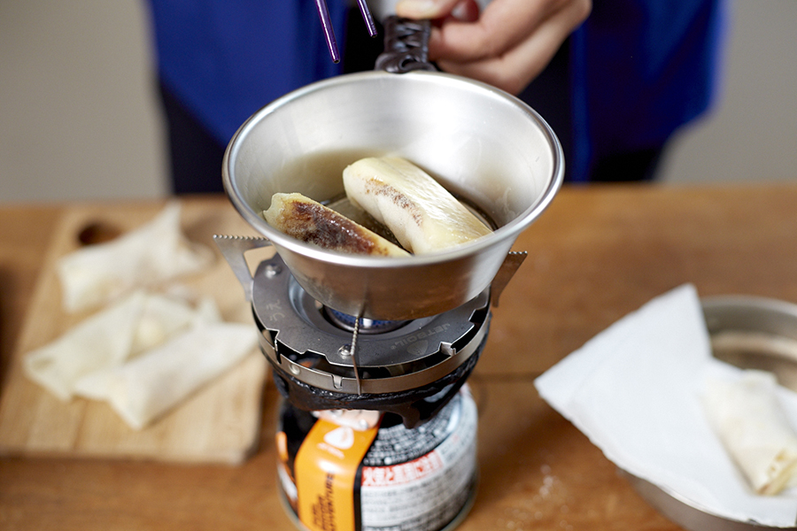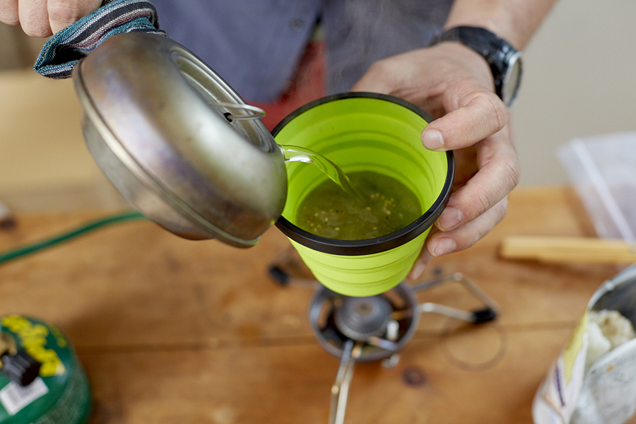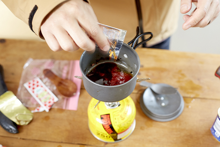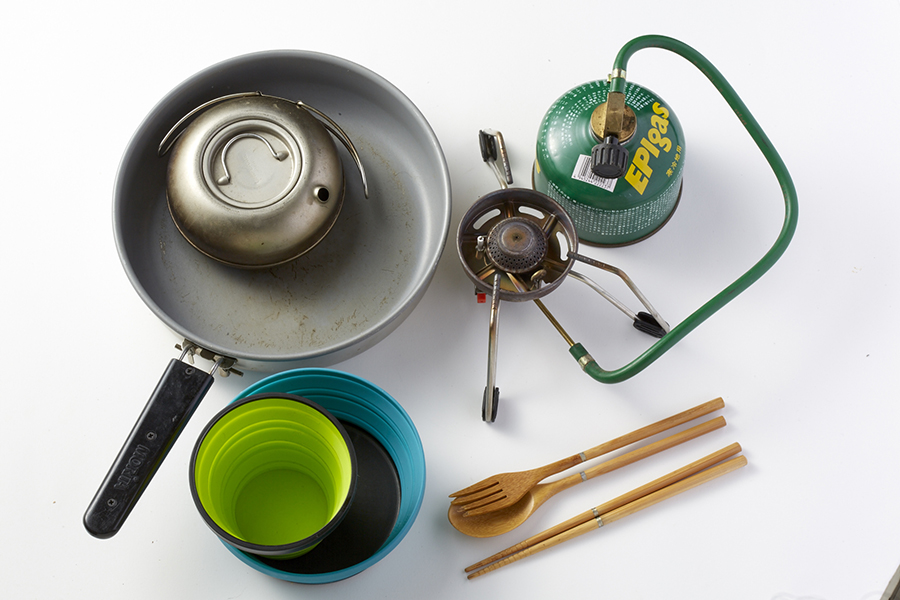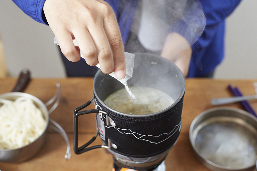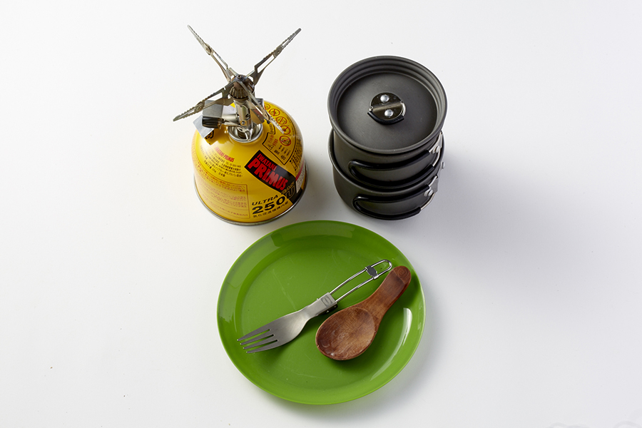 乾燥食材をお湯で戻すだけという簡単な調理法から道具はシングルバーナーと小型フライパンのみ。