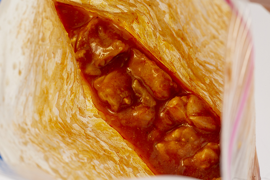 ★自宅で事前に焼き鳥を串から外し、下味調味料といっしょにジップロックに入れてしっかりもみ込んでおく。