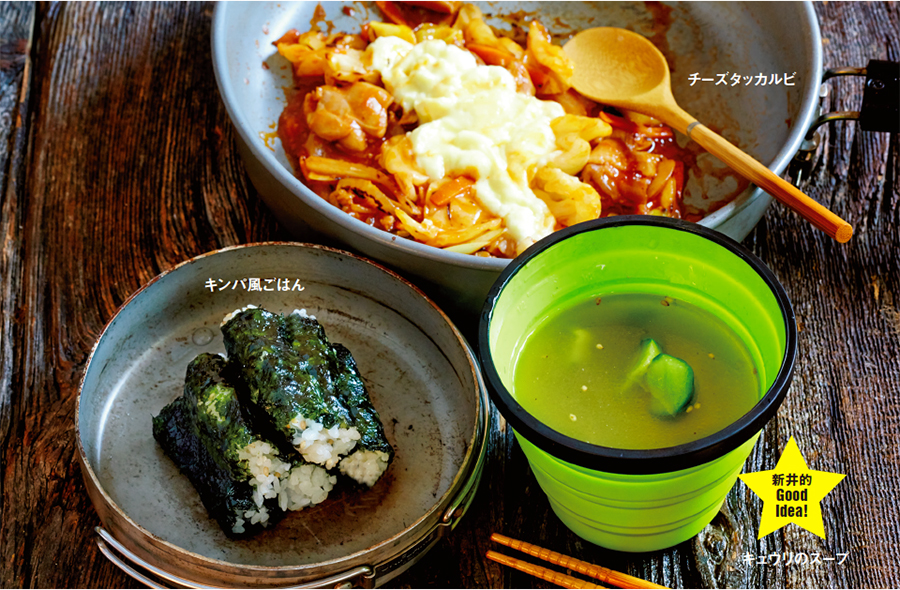 これは使える! と思ったのがキュウリのスープ。簡単でみずみずしく本当においしかった。材料が手に入りやすいうえに、冷やしスープやオツマミなどアレンジが豊富なのもいいですね。タッカルビは見た目のインパクトと、チーズ×コチュジャンの組み合わせが最高! これは間違いなくビールが必要です。あとフリーズドライにアレンジができるなんて、キンパも目からウロコでした。みんなで山の上でパーティしてもいいかも。